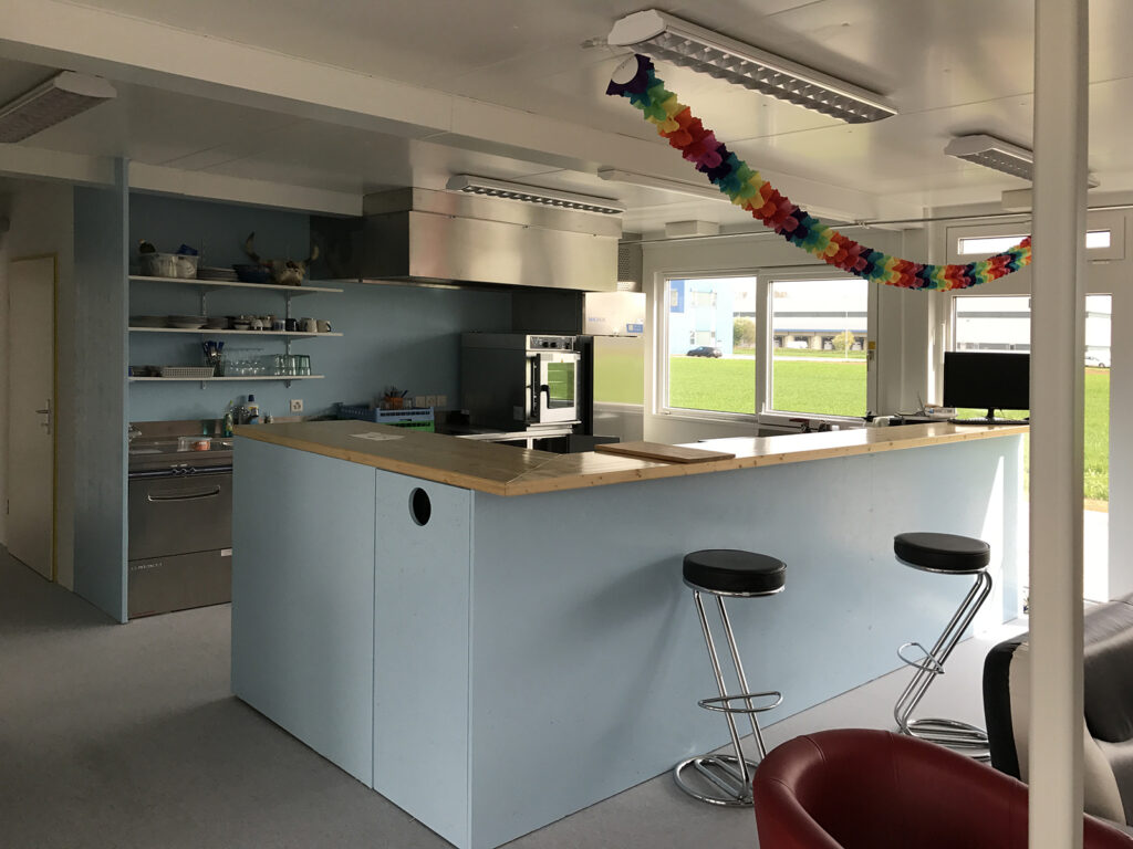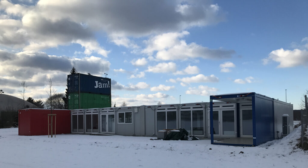 Das Hauptgebäude vom Jugendhaus mit dem Büro der Jugendarbeit besteht aus gedämmten Raummodulen.