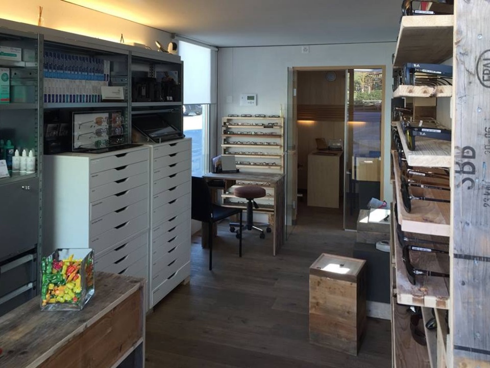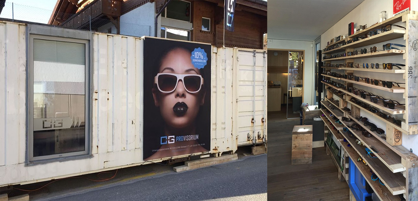 AtelierKoffer Das Verkaufslokal, die Buvette oder das Atelier im mobilen Wechselkoffer/Container …oder als Bauprovisorium wie hier für Optik Gstaad: